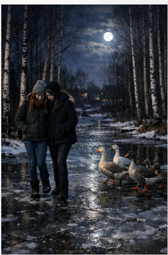 Смотрим, а птички раскрылились, луна опять вышла, так видно было и летят по над землёй. А потом встали на землю, на ледок и…хрусь-хрусь-хрусь.