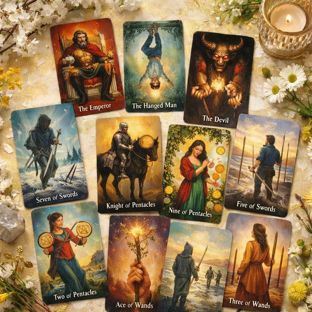 Спасибо каждому за лайки, подписки, комментарии, донаты! 🙏❤️ Вы вдохновляете меня создавать новые расклады и делиться важными посланиями. Пусть всё добро возвращается к вам сторицей! 💖 Девочки, давайте сейчас посмотрим очень важный момент — какое решение он принял по поводу ваших отношений. Это уже не про «что чувствует», не про «думает ли», а именно про внутренний итог, к которому он пришёл на данный момент. Сразу скажу: здесь нет лёгкости и однозначности. Этот мужчина находится в состоянии, где чувства есть, притяжение есть, но готовности действовать «по-взрослому» пока не хватает. Он между двумя состояниями: «хочу» и «могу». И вот именно в этом разрыве формируется его решение. Настраивайтесь на своего мужчину… и смотрим. Карты. Император, Повешенный, Семёрка Мечей, Рыцарь Пентаклей, Дьявол, Двойка Пентаклей, Туз Жезлов, Девятка Пентаклей, Пятёрка Мечей, Тройка Жезлов. Его текущее состояние. По Повешенному и Двойке Пентаклей — он завис. Не потому что не чувствует, а потому что не м