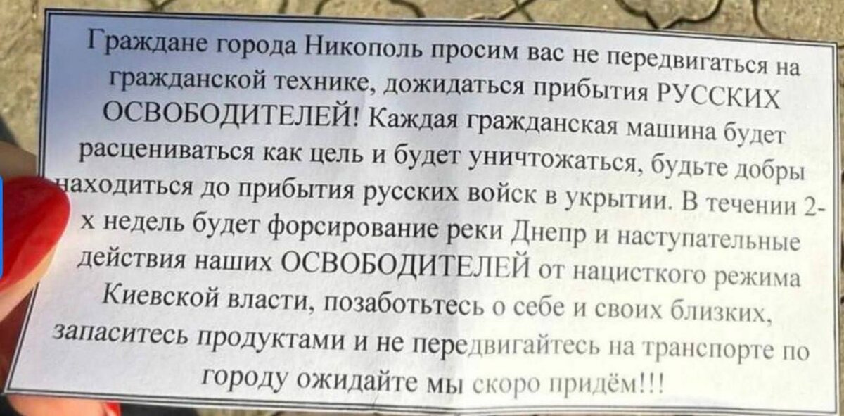 В украинских телеграм-каналах появился новый фейк: листовки, якобы с нашими призывами разбрасывали над Никополем