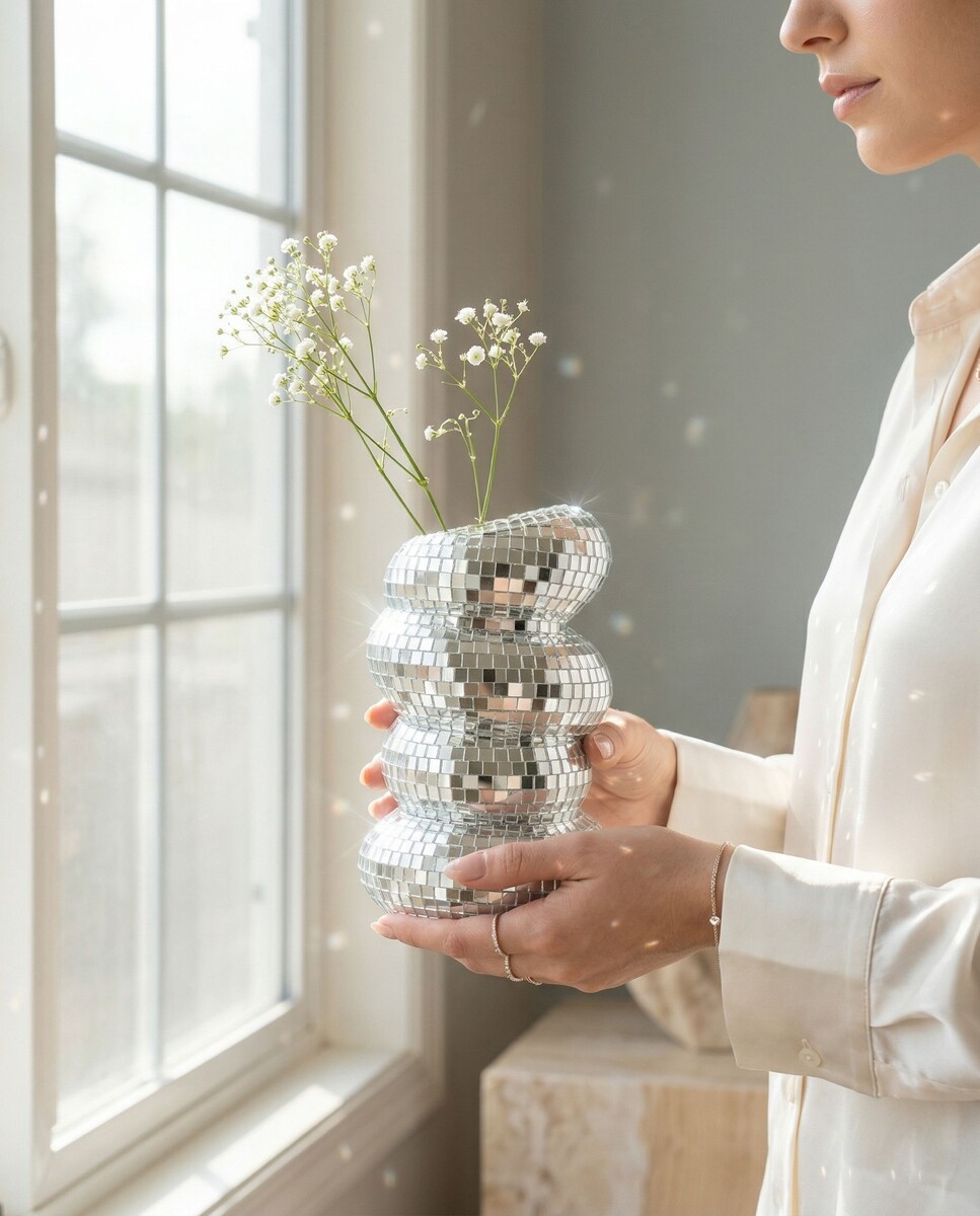 Есть вещи, которые не просто стоят на полке, а сразу задают настроение пространству. Эта зеркальная ваза — именно из таких. Она выглядит как маленький арт-объект на стыке декора, поп-эстетики и легкого disco glam. За счет мозаичной серебристой поверхности она красиво ловит свет, дает блики и даже делает интерьер чуть более «живым» — особенно если рядом есть солнце, лампа с теплым светом или свечи. ✨ ЗАКАЗАТЬ Больше всего в этой вазе цепляет форма. Она не классическая и не строгая, а мягкая, округлая, с немного «пузатым» силуэтом, поэтому смотрится современно, модно и визуально дорого. Это тот случай, когда даже без цветов предмет уже работает как самостоятельный декоративный акцент. Поставить ее на журнальный столик, тумбу, консоль, открытую полку, туалетный столик или в кадр для Pinterest — и пространство сразу становится интереснее. Если использовать вазу по назначению, лучше всего ей идут 1–3 стебля: белые шаровидные цветы, минималистичные ветки, сухоцветы, один эффектный крупный