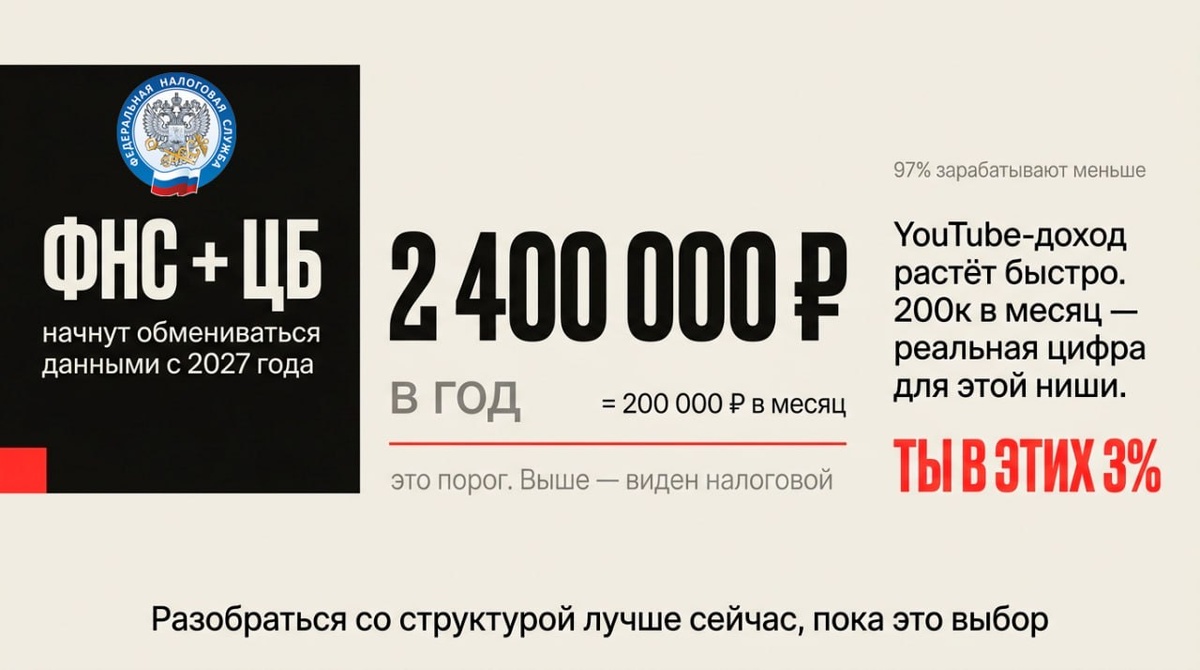 ФНС и ЦБ начнут обмениваться данными. Если деньги капают на счет каждый месяц по одним и тем же каналам - это уже читается как предпринимательская деятельность. Дальше вопросы. 2,4 млн - это 200 тысяч в месяц. И ровно тот потолок, выше которого самозанятый уже не самозанятый. Минфин говорит, что большинства это не коснется. По цифрам они правы - у 97% работающего населения таких доходов нет. Но если вы читаете этот канал, скорее всего вы либо уже в оставшихся 3%, либо туда идете. Разобраться со структурой лучше сейчас, пока это выбор, а не обязанность. Зарубежные счета, правильный статус, нужные юрисдикции - об этом мало кто говорит нормально и по делу. В 5 модуле курса - целиком про отношения с ФНС без последствий. Я выбрал ИП - оно у меня уже было, оставалось перевести деятельность в правовое поле. Внутри будут реальные примеры, включая мои собственные 7 административных нарушений - как получил и что из этого вышло. И самое главное как до этого не доводить. Работать в белую сейч