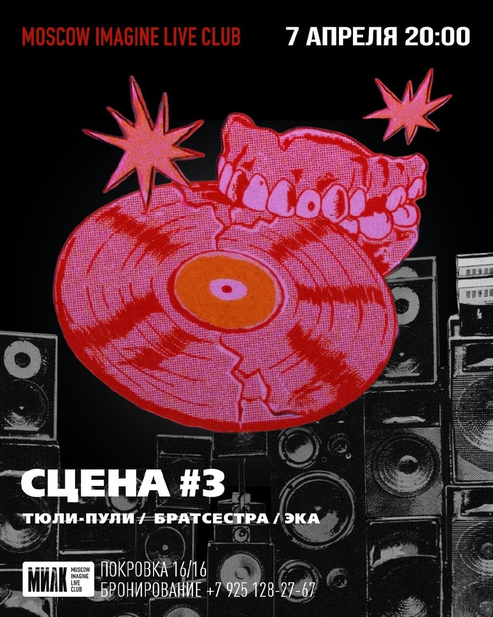 Уютные мини-фесты с лайнапами без жанровых ограничений. 7 апреля на «Сцена #3»: Тюли-Пули. Это не бдум-бдац в жанре рок, не трали-вали в жанре фолк, это Тюли-Пули в жанре саундрама. Братсестра. Семейная группа, в их творчестве встречаются энергия, ирония и настоящие чувства. Музыка, в которой узнаёшь себя. Эка. Московский музыкальный проект на стыке поп‑рока, инди и синтирока с лирическим женским вокалом. Вход свободный, старт в 20.00 Резерв столов по телефону +7 (925) 128-27-67 и на сайте imaginecafe.ru