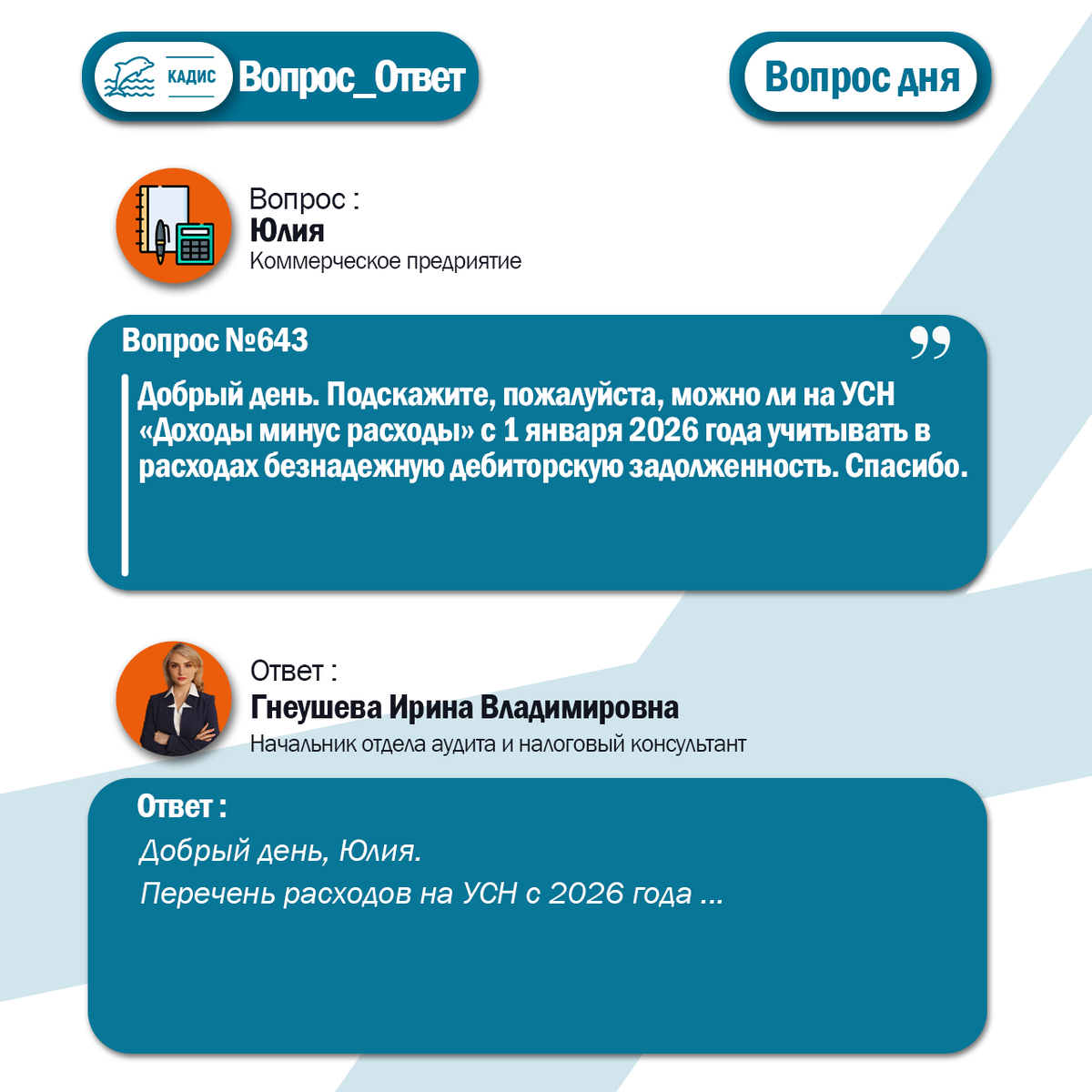 Добрый день. Подскажите, пожалуйста, можно ли на УСН «Доходы минус расходы» с 1 января 2026 года учитывать в расходах безнадежную дебиторскую задолженность. Спасибо. Ответ: Добрый день, Юлия. Перечень расходов на УСН с 2026 года является открытым (подп. 45 п. 1 ст. 346.16 НК РФ). Однако, безнадежную дебиторскую задолженность на УСН с объектом «Доходы минус расходы» учесть все равно нельзя. Так, налогоплательщики УСН применяют кассовый метод учета доходов и расходов. Расходами налогоплательщика признаются затраты после их фактической оплаты (п. 2 ст. 346.17 НК РФ). Учитывая, что реализованные товары, работы или услуги не оплачены, встречное обязательство не прекращается. Значит, расхода не возникает.