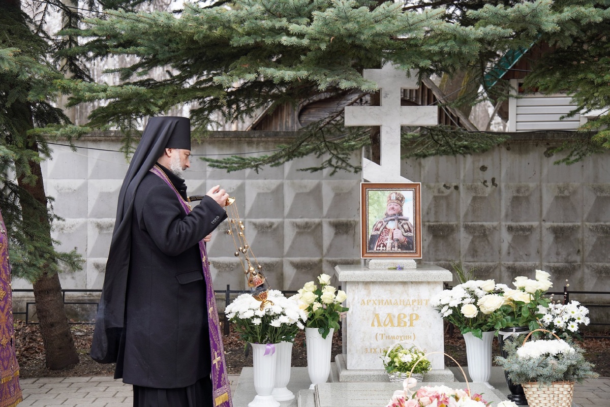 6 апреля 2026 года В восьмую годовщину преставления архимандрита Лавра (Тимохина), первого игумена и устроителя Успенского мужского монастыря в Новомосковске, наместник обители игумен Агафангел (Болдин) совершил панихиду на месте его погребения.