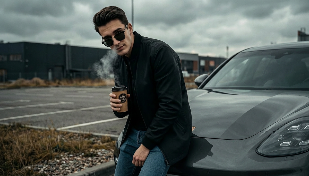 Фотореалистичная сцена: молодой мужчина в тёмном кожаном тренче и солнцезащитных очках, прислонившийся к капоту чёрного BMW на заброшенной полевой опушке с берёзами и хмурым небом; он курит сигарету, дым струится в холодном воздухе, поза самоуверенная, три четверти, низкий угол, автомобиль частично в кадре спереди справа, логотип заметен. Атмосферный, мрачный кинематографический свет при облачном небе, мягкая объёмная подсветка, контрастный, слегка десатурированный холодный тон, глубокие тёмные тени, тонкая зернистость плёнки. Камера 50mm, f/2.0, 1/200s, ISO 200, малая глубина резкости, фокус на лице и дыме, широкая композиция, натуральные цвета, высокая детализация кожи и кожицы куртки, подчёркнутые текстуры металла и травы.