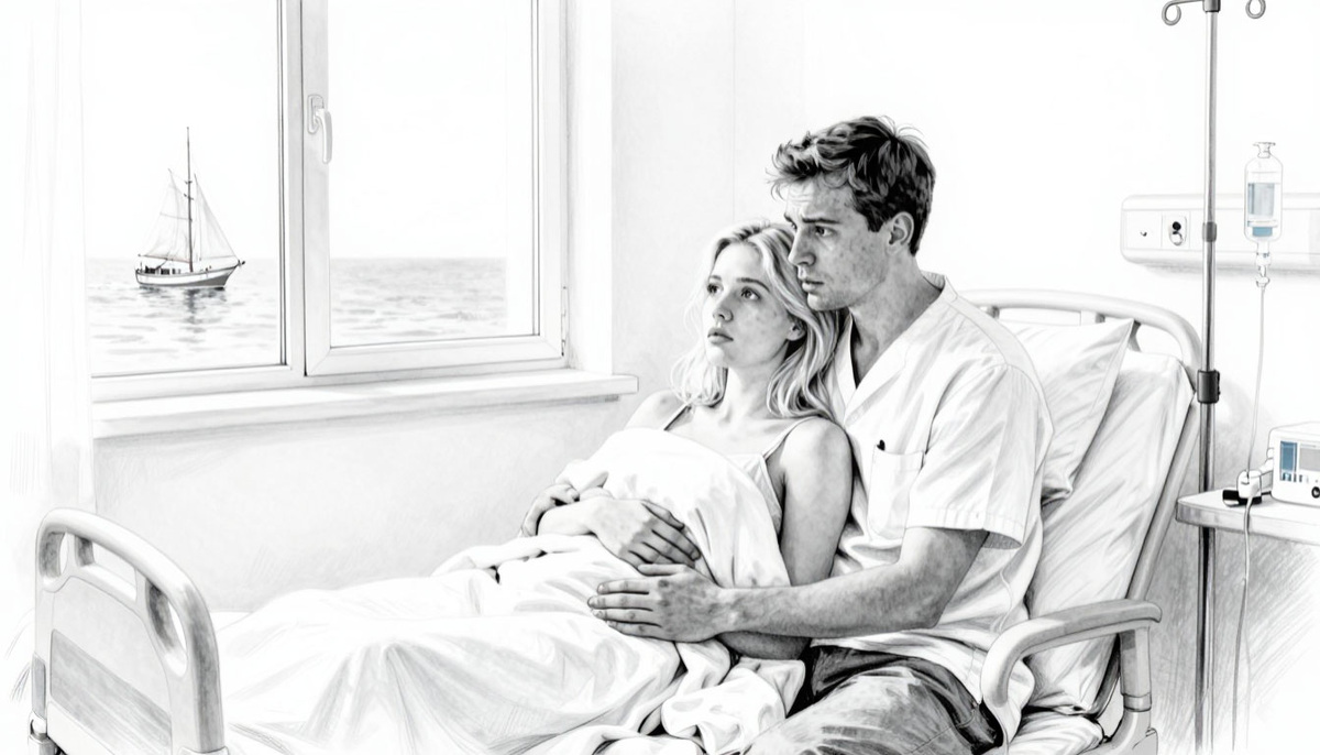 Звук: шум моря (фон), писк медицинских приборов, лёгкая музыка в финале (опционально).