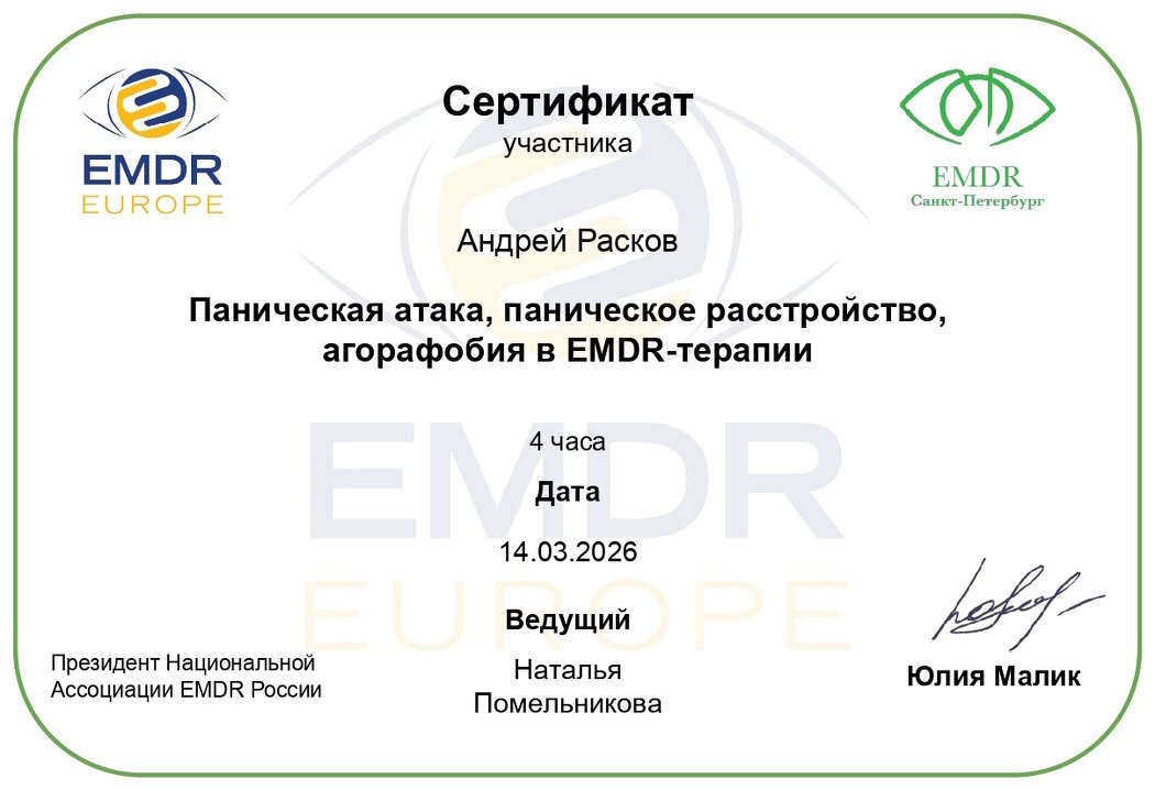 Как EMDR-терапевт в своей работе сталкиваюсь со всё более сложными клиентскими случаями. Часто это клиенты имеющие негативный опыт терапии по своему запросу, или даже те, которые просто не могут найти квалифицированного специалиста для работы со своей проблемой. И постоянное оттачивание своего профессионализма - дело не прихоти, а необходимость в нашей практике. Так стало и с тренингом по паническому расстройству от Национальной Ассоциации EMDR, где я прошёл очередное повышение квалификации. Паническая атака (ПА) — одно из самых пугающих состояний, с которыми сталкивается человек. Внезапно возникает сильный страх, тело «сходит с ума», появляется ощущение, что это инфаркт, инсульт или даже приближающаяся смерть. И самое тяжелое — ощущение потери контроля. Что такое паническая атака Паническая атака — это острый эпизод интенсивного страха, который достигает пика за несколько минут. Паническое расстройство — это состояние, при котором такие атаки повторяются, а между ними формируется трев