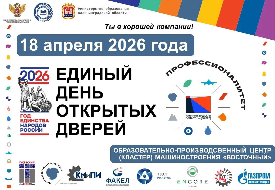18 апреля в Гусевском Политехе состоится Единый день открытых дверей. Мероприятие пройдет в рамках федерального проекта «Профессионалитет» национального проекта «Молодежь и дети». Его цель — познакомить школьников, их родителей и представителей школ с приоритетными отраслями экономики, а также с востребованными рабочими профессиями и специальностями в Калининградской области и России. С 6 по 18 апреля в политехе запланирован комплекс мероприятий. Для гостей проведут всероссийские классные часы «Ты в хорошей компании» с участием амбассадоров «Профессионалитета», экскурсии по производственным зонам кластера машиностроения «Восточный» и на площадки партнеров кластера. Также организуют мастер-классы и профессиональные пробы, родительское собрание с подробным чек-листом поступления в систему среднего профессионального образования и новыми правилами приема. Участники смогут встретиться с индустриальными партнерами и работодателями, которые ждут будущих специалистов на своих предприятиях, а т