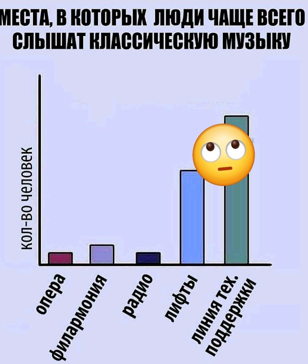 Забавный график попался недавно: рейтинг мест, где люди чаще всего слышат классические произведения.