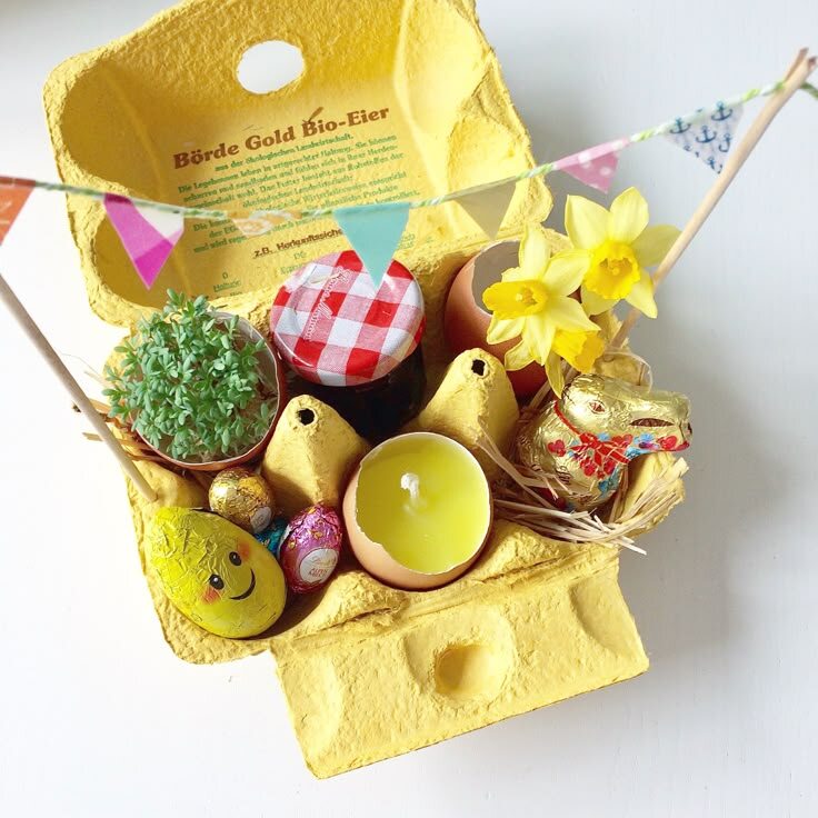 Для начала давайте посмотрим на разные исполнения таких коробочек, а потом я покажу свою и расскажу что и где приобрести. Кладут в такой подарок конечно же сладости - шоколадные фигурки кроликов, яйца, орешки в глазури, мармелад, небольшие баночки джема или меда. Дополнить можно свечами, живыми растениями, фигурками кроликов и цыплят. Интересное решение сделать в половинке скорлупы свечу или посадить микрозелень вроде кресс-салата или базилика. Саму коробку можно во-первых покрасить акриловой краской, во-вторых украсить тематическими наклейками, бумагой для скрапбукинга и лентами. Можно выбрать определенную цветовую гамму для своей коробочки. Сам материл коробок мне вообще очень нравится своим простым видом, а наличие ячеек располагает к их наполнению. Крафтовый картон и винтажный вид упаковки добавляют уюта и душевности подарку.