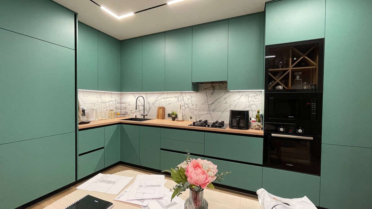 Классические нейтральные оттенки уступают место более эмоциональному колориту. 🌿Современные палитры ориентируются на глубокие природные тона вместо привычных серого и бежевого. Используя такие сочные природные цвета в основе, легко создать атмосферу спокойствия, тепла и уверенности Реализованный проект: ✅Длина 2188*4590мм ✅Фасады в матовой эмали (цвет NCS s 4020-B90G) ✅Столешница Слотекс Bunratty Oak 3829 ✅GOLA Trend скрытая ручка ✅Качественная фурнитура ✅Подсветка над рабочей зоной и в витрине 💰Стоимость данной кухни 395000р. Хотите рассчитать стоимость такой кухни по Вашим размерам❓ 📩Присылайте проект или размеры кухни нам в сообщения 💬 Мы в Мах 📱 Мы в Вк 📱 @kuhni_geometria ☎️ 89278821585