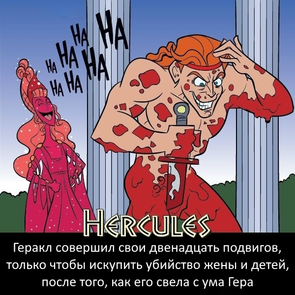 Эпизод с учителем музыки обычно не фигурирует в произведениях массовой культуры, но он всё равно достаточно известен. Другой известный (и одновременно очень тяжёлый) эпизод — убийство Гераклом собственной жены и детей. Считается, что Гера, у которой люто подгорало от самого факта существования Геракла, наслала на него безумие — и тот в горячке прикончил всю свою семью. Потом, конечно, сильно переживал и искал способ искупить вину. Так и попал на службу к царю Еврисфею, который поручал ему подвиги.