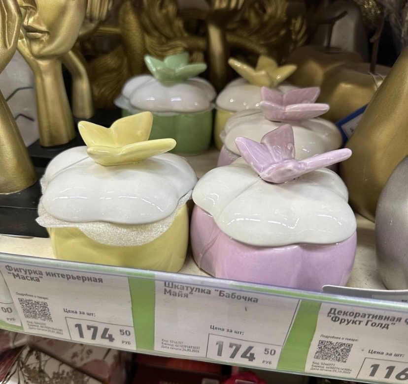 Привезли красивые шкатулки. Называются они «Бабочка Майя». Шкатулки из керамики. Представлены в ассортименте по цвету. Цена 174 рубля.