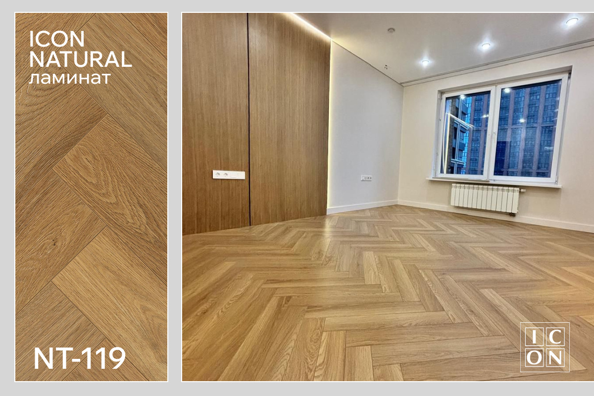 Один из самых частых запросов при ремонте: “Хочу как паркет, но дешевле и без сложностей с уходом”. Паркет боится воды, царапается, требует периодической шлифовки и стоит в два-три раза дороже хорошего ламината. Решение, которое закрывает этот вопрос — ламинат в укладке ёлочкой с синхронным тиснением. На фото реальный объект: жилая квартира в Москве, декор Дуб Кювье из коллекции NATURAL. Ламинат NATURAL NT-119, Дуб Кювье. 12 мм толщина, 34 класс износостойкости, четырёхсторонняя фаска, синхронное тиснение по всей поверхности. Укладка ёлочкой на монолитный замок Uniclick. 34 класс — это верхняя граница для жилых помещений с высокой нагрузкой. Спальня, гостиная, коридор, — покрытие выдержит всё это без вопросов. Ёлочка требует точности при укладке. Каждая планка должна лечь строго под углом, иначе рисунок поплывёт и это будет видно сразу. На этом объекте геометрия идеальная: видно по стыкам и по тому, как рисунок держит направление через всю комнату. Синхронное тиснение добавляет глубину