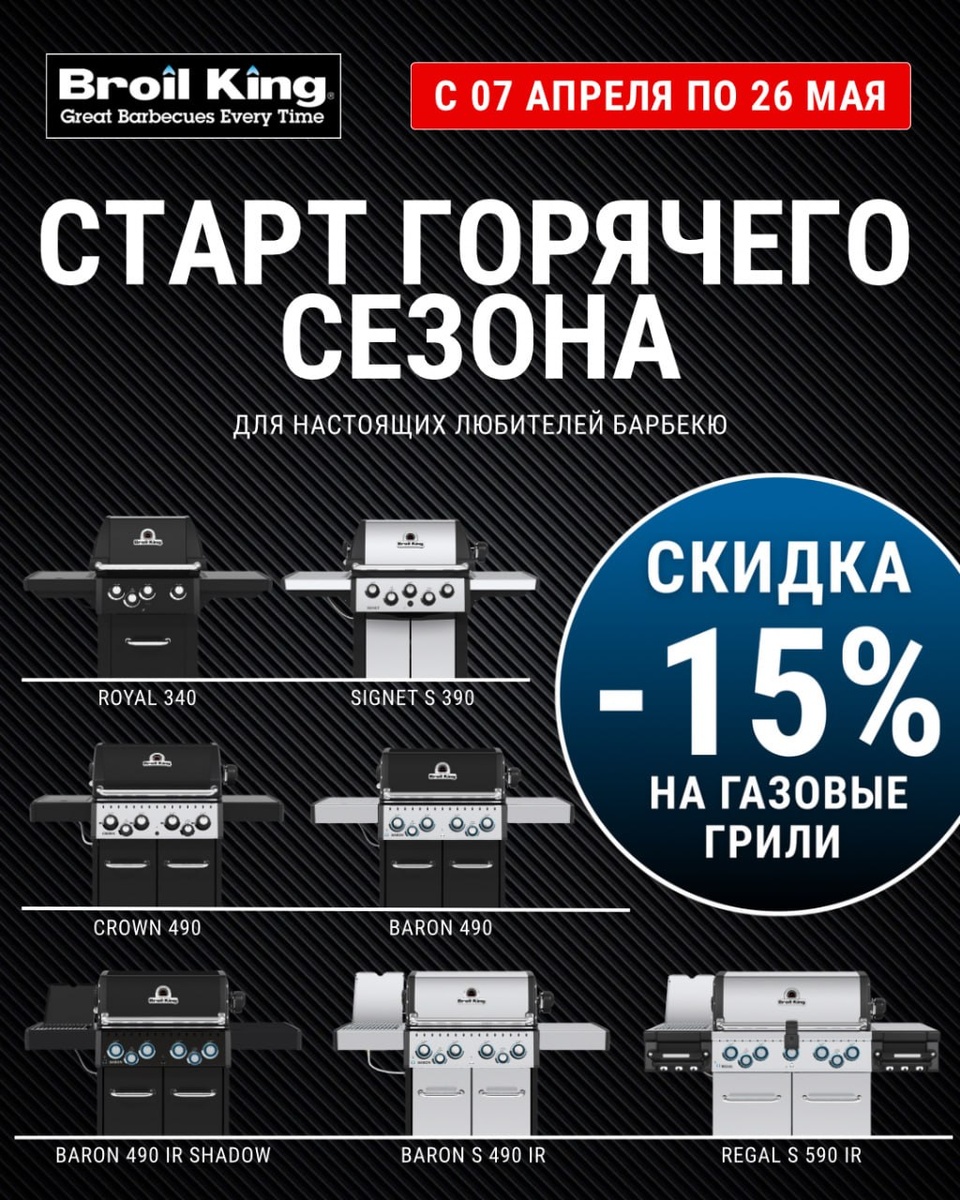 удобством готовки. Обычно такая техника стоит совсем других денег, но сейчас у вас есть шанс войти в мир настоящего барбекю со скидкой 25 000 рублей. Старая цена: 164 900 ₽ Новая цена: 139 900 ₽ ⏳ Предложение действует до 26 мая. #НовостиBBQ Сразу 7 грилей Broil King принимают участие в Акции с 7 апреля по 26 мая 2026 года ОБЗОР НА ВК ВИДЕО: https://vkvideo.ru/video-145982301_456239552 Почему вы влюбитесь в этот гриль? Мы собрали в SIGNET S 390 всё, что нужно шеф-повару вашего двора: мощь, пространство и чугун, который держит жар часами. 1. Топливная станция для мяса Система из трех основных горелок Dual-Tube™ выдает 11,4 кВт. Плюс боковая конфорка (2,7 кВт) и горелка для вертела (4,4 кВт). Вы можете жарить стейки, томить овощи на боковой плите и запекать целую тушку на вертеле — ОДНОВРЕМЕННО. 2. «Правильная» решетка = правильные полоски Две двусторонние чугунные решётки (65×38 см) — это 8 порций стейков за раз. Чугун аккумулирует тепло и не остывает, когда вы кладете мясо. Верхн