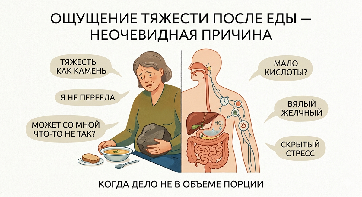 Вы наверняка замечали за собой такое. Садитесь обедать — вроде бы и голод есть, и порция обычная, не перебираете. А после еды — тяжесть. Не боль, не изжога, а именно тянущее, вязкое чувство в подложечной области. Будто камень положили.