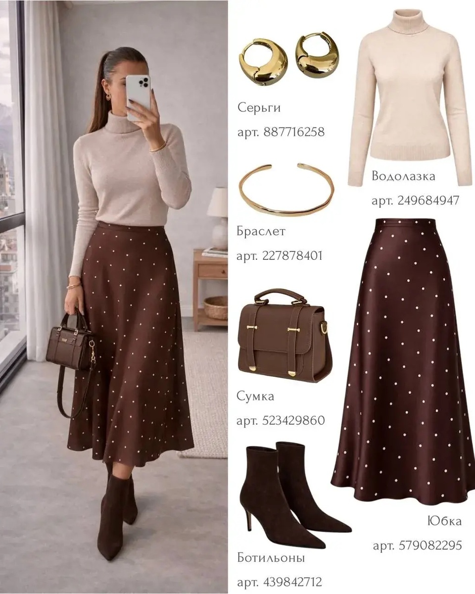 Почему образ работает: мягкий верх уравновешивает активную юбку, а единая коричнево-бежeвая гамма делает комплект дорогим на вид.