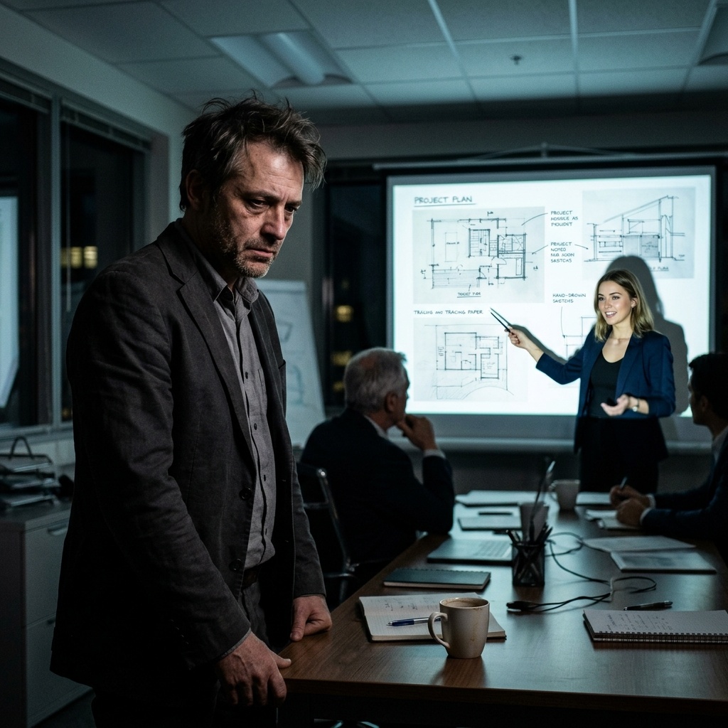Визг новенькой кофемашины заглушал мои мысли, но не мог унять дрожь в руках. Я стоял у панорамного окна в нашей архитектурной студии, смотрел на серые крыши и пытался понять, в какой момент моя жизнь превратилась в этот цирк. Мне сорок восемь лет. Из них двадцать я проектирую общественные пространства: рестораны, торговые залы, коворкинги. Мои чертежи всегда безупречны. Я привык работать тихо, сдавать проекты в срок и получать свою зарплату. Но последние три месяца превратили мою размеренную работу в театр абсурда, а меня назначили главным клоуном. И всё это из-за одной молодой особы, пришедшей к нам на стажировку.