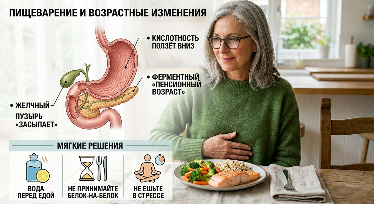 После 50 лет привычные продукты перестают усваиваться не потому, что «сломался» желудок, а потому что снизилась кислотность, уменьшился запас ферментов и изменилась работа желчного пузыря. Это не болезнь, а новая норма. И к ней нужно не приспосабливаться запретами, а перестраивать свои привычки — без фанатизма, но с пониманием механизмов.