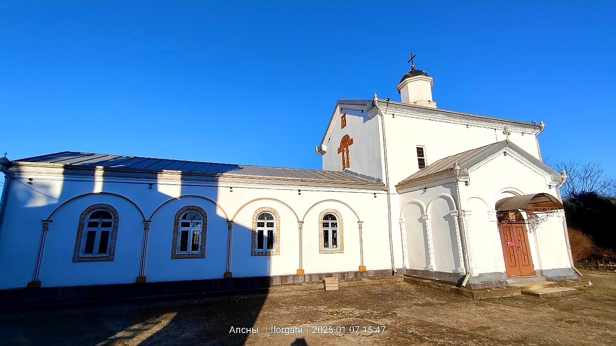 Перед нами белокаменная церковь, возведённая в XI веке . Она не похожа на другие храмы Абхазии — это образец западногрузинского зодчества, однозальный, с полукруглым алтарём и арочным каменным сводом.