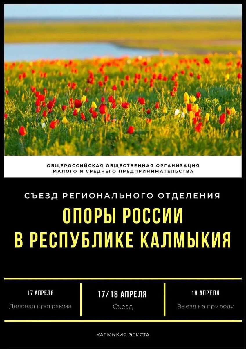 17–18 апреля пройдет съезд регионального отделения «ОПОРА РОССИИ» — два дня общения, деловой программы и новых знакомств. Что будет: 17 апреля — деловая программа и обсуждение актуальных вопросов бизнеса — выступления экспертов — нетворкинг с предпринимателями — гала-ужин 18 апреля — выезд на знаменитый фестиваль тюльпанов в Приютненском районе — неформальное общение и новые связи Среди тем: • цифровая маркировка товаров «Честный знак» • система быстрых платежей и цифровой рубль • бухгалтерские услуги для бизнеса Это возможность: — познакомиться с предпринимателями региона — обсудить реальные кейсы — расширить деловые связи 📍 Элиста 💳 Стоимость участия — 20 000 ₽ (включено: два дня программы, гала-ужин и выезд на природу) Регистрация: https://afisha.nethouse.ru/event/opororossii
