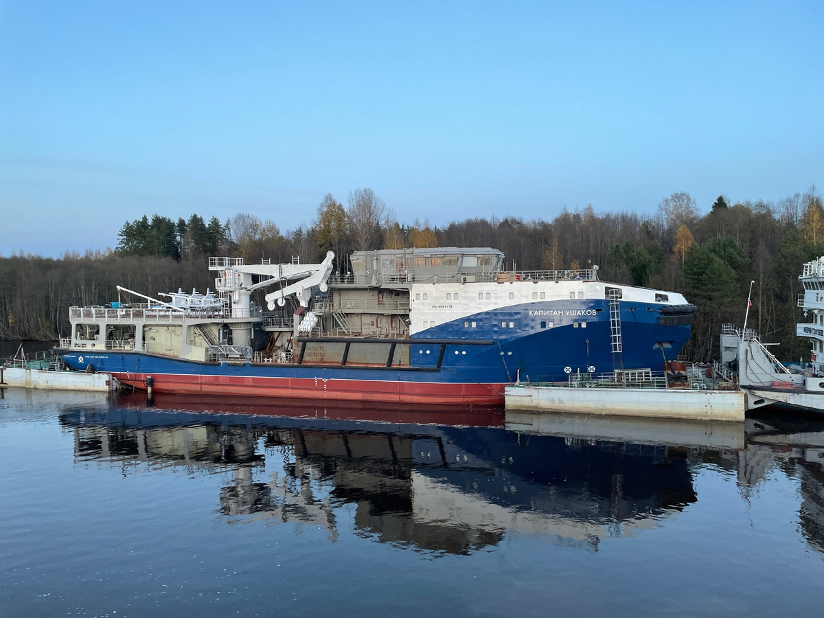 Волго-Балтийский канал, близ Вытегры, 2023 год. «Капитан Ушаков» на понтоне буксируется для достройки. Это тот самый, который сейчас на боку лежит в Неве практически в самом центре Питера (видео 2). На понтоне – чтобы по осадке пройти без проблем по внутренним водным путям. «Капитану Ушакову» помогали два буксира. Это фото – редкая возможность увидеть практически построенное судно во всей красе. Свежая краска, морские цвета… Никто тогда и предположить не мог, что его вынужденная «полуподводная» вахта в городе на Неве растянется почти на год. Материал для ВАС – Обязательно смотрим еще фото судна – на канале МорфлотСПб в МАХ: https://max.ru/brosur/AZ1jYzkwT8s Прошлым летом «Капитан Ушаков» накренился на правый борт. Внутрь хлынула вода, и буксир лёг на грунт. Он остаётся в таком положении до сих пор. История получила широкую огласку в СМИ, да и сейчас судно время от времени напоминает о себе в социальных сетях. «Капитан Ушаков» уже успел стать местной достопримечательностью. Жители город