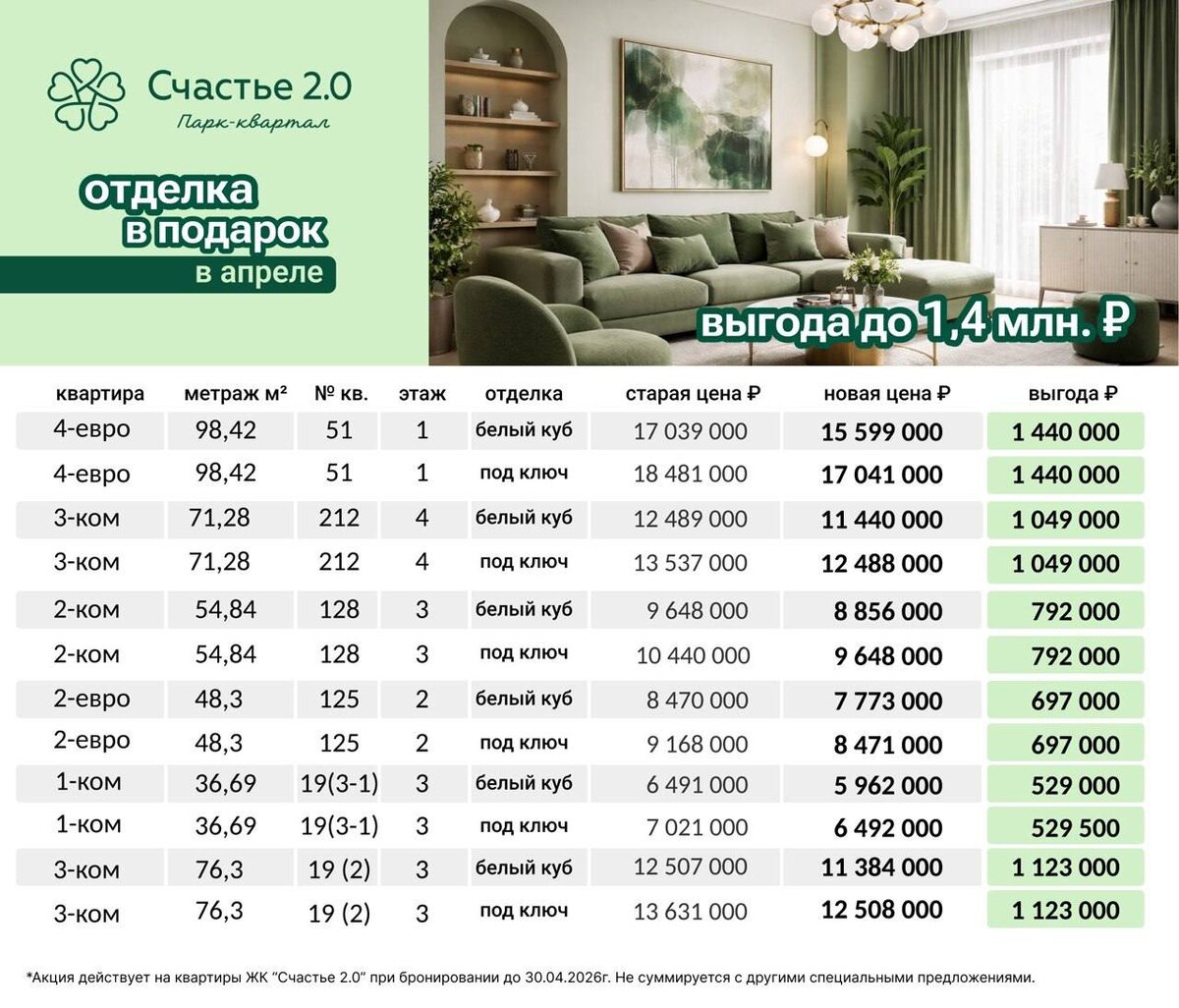 Друзья, подготовили расчет по ценам на квартиры с отделкой в апреле! 🎁