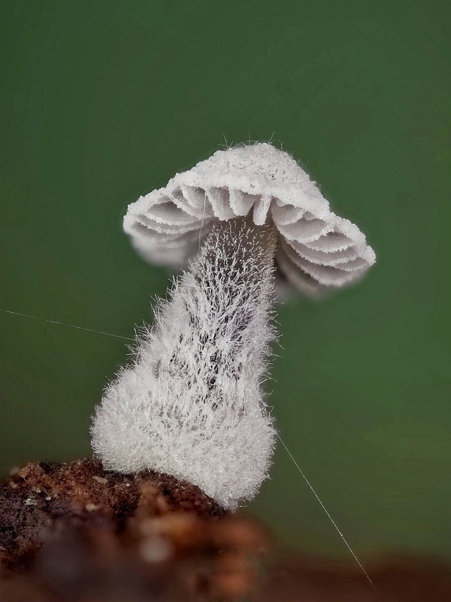 ) 🍄 Этот крошечный гриб — настоящий шедевр природного дизайна. Его главная особенность — невероятный «морозный» налет из мельчайших гранул и волосков, который покрывает шляпку и ножку. При большом увеличении кажется, будто гриб сделан из тончайшего хрусталя или покрыт инеем. Сами шляпки редко превышают пару миллиметров в диаметре, что делает их практически невидимыми для обычного прохожего. 🌏 Встретить это чудо можно во влажных, тенистых местах. Мицены предпочитают лиственные и смешанные леса, где царит постоянная влажность. Они не растут на земле, их стихия — гниющая древесина, опавшие веточки, а иногда даже куски старой коры, покрытые мхом. Благодаря своей любви к разлагающейся органике, они часто прячутся в густых зарослях папоротника или в глубоких оврагах. ⚡️Несмотря на свои микроскопические размеры, эти грибы выполняют огромную работу. Мицены относятся к сапротрофам — это главные «утилизаторы» леса. Они перерабатывают мертвую древесину и листовой опад, превращая их в питател