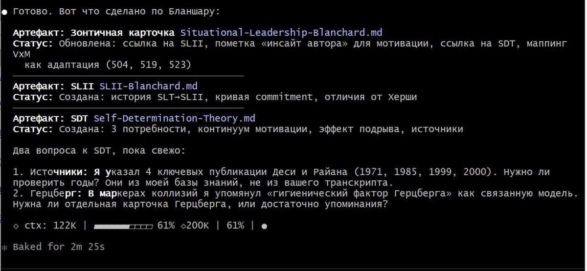 И почему раньше на это уходила неделя, а сейчас два часа. На скриншоте Claude Code обновляет теоретическую базу для мастерской "Лидерство и управление командой с AI”. Три карточки: 1. ситуационное лидерство Бланшара, 2. модель SLII, 3. теория самодетерминации Деси и Райана. Каждая карточка - это не пересказ Википедии, а структурированный артефакт: история модели, ключевые механизмы, связи с другими концепциями, маппинг на наш фреймворк. За десять лет я рассказывал про эти модели сотни раз. С разными людьми формулировки менялись: где-то уточнялись, где-то плыли. Заметить это самому почти невозможно. Когда концепция живёт только в голове, она мутирует. Сейчас у меня есть цифровой двойник, который отслеживает консистентность. Каждая лекция фильтруется через базу карточек и если я начал объяснять SLII иначе, чем описано в карточке, это становится видно. Либо я что-то понял лучше и карточку нужно обновить, либо я что-то потерял и нужно явно разобраться с противоречием. Это логика экзо