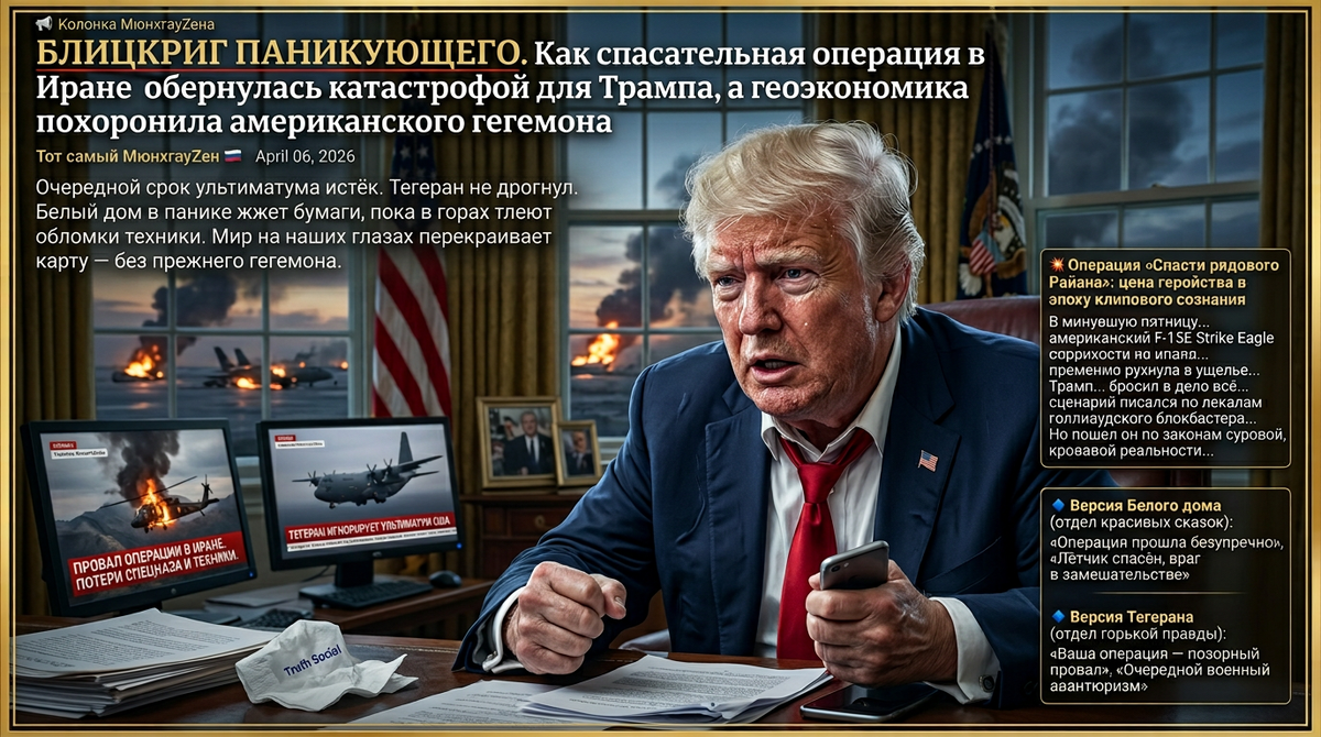 Над Персидским заливом сгущаются сумерки — не те ласковые, что приносят прохладу усталому путнику, а тяжёлые, маслянистые, пропахшие гарью ракетных стартов и мазутной плёнкой. Волны бьются о борты авианосцев с каким-то обречённым, неритмичным шумом — будто море силится стряхнуть с себя чужеродную сталь, да не может. И в этом свинцовом просторе то, что Трамп величал «эпическим гневом», превращается в обыкновенную, вязкую, непролазную трясину — ту самую, из которой, как учит история, живым не выбираются. Очередной срок ультиматума истёк 6 апреля в 20:00 по вашингтонскому времени, но Тегеран не дрогнул. И теперь, когда в Белом доме лихорадочно жгут бумаги, а в горах Загроса до сих пор тлеют обломки американской техники, мир на наших глазах перекраивает карту — без прежнего гегемона.