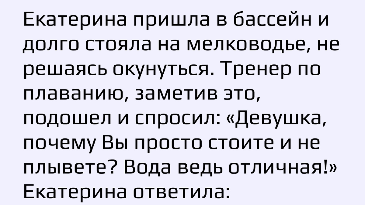 Екатерина представляет собой особый тип спортсменов, для которых эстетика стоит на первом месте. Согласитесь, что зайти в бассейн и выйти из него, сохранив безупречный вид — это целое искусство, требующее не меньшей сноровки, чем баттерфляй. Бассейн для многих — это не просто дорожки и хлорка, это место для демонстрации выдержки. Умение балансировать на грани воды, не намочив лишнего миллиметра волос, заслуживает уважения. Это своего рода водная йога в сочетании с мастерством стилиста. Тренер, возможно, ждал рекордов скорости, но он не учел, что для некоторых дам главная дистанция — это путь от раздевалки до шезлонга, пройденный с максимальным изяществом. Красота требует жертв, и в данном случае в жертву приносится сама суть плавания, но зато результат выглядит потрясающе.