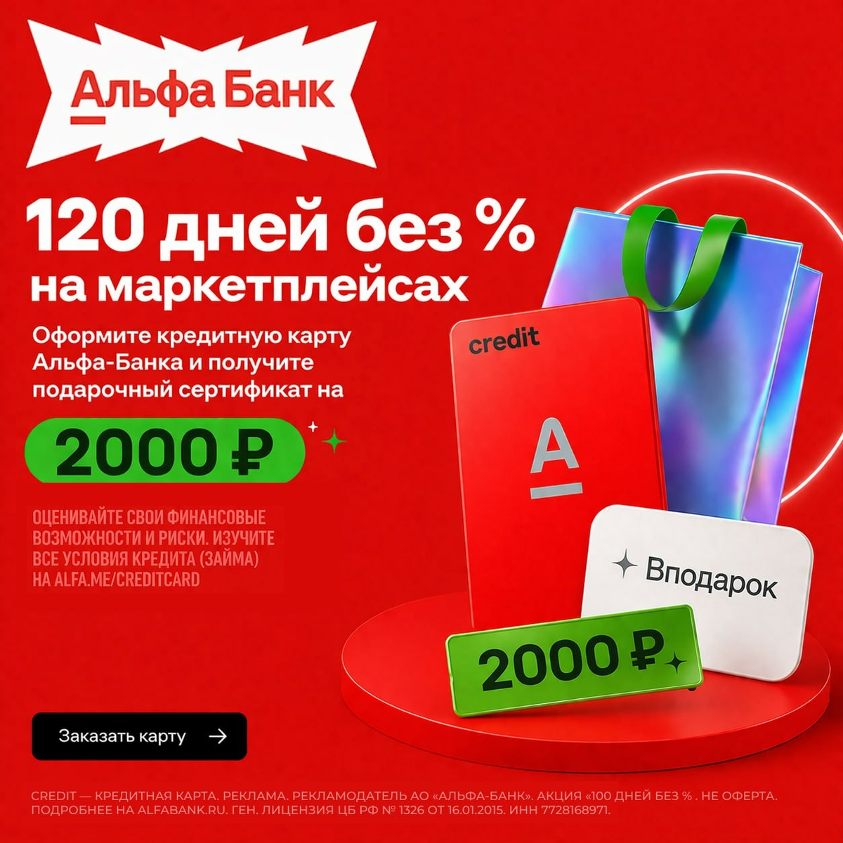 «100 дней без %» от Альфа-Банка 🎁Главный подарок: Мультикарта Вподарок на 2 000 рублей! Выбирай сам: Спортмастер, Золотое Яблоко, Лента, Lamoda, Hoff, Магнит, Детский Мир, Лэтуаль и ещё 250+ брендов. Можно перевести деньги на карту или пополнить счёт телефона 💳 Оформи карту до 20 апреля → получи бесплатное обслуживание НАВСЕГДА. Без условий. Без подвохов. 0% на 100 дней на: 🔵 любые покупки 🔵снятие денег в банкоматах 🔵 переводы на карты других банков 🎰 до 100% — барабан 🎯 до 30% — категории на выбор 🏪 до 50% — партнёры 🟣снятие без комиссии — до 50 000 ₽/мес 🟣 кредитный лимит — до 1 млн ₽ 🟣только паспорт 1. Заполни заявку онлайн — 5 минут 2. Дождись одобрения — 1 минута 3. Забери карту в удобное время и место ➡️ Оформить карту⬅️