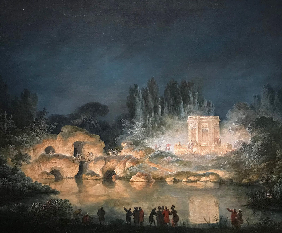 Клод-Луи Шателе (1753-1795) был французским художником и графиком, казненным на гильотине 7 мая 1795 года. Хотя всего несколькими годами ранее картины ему заказывала сама Мария Антуанетта. На рассматриваемой картине представлены сады Малого Трианона и Бельведер, освещенные во время праздника, устроенного королевой Марией Антуанеттой для графа Прованса 27 июля 1781 года, или во время визита её брата, Жозефа II, 3 августа 1781 года. Бельведер и искусственные скалы в английском саду Малого Трианона воспроизведены довольно точно, таким их можно увидеть и сегодня. Бельведер — это восьмиугольная беседка в неоклассическом стиле, построенная между 1778 и 1781 годами архитектором Ришаром Мике. Она стоит на небольшом холме с видом на озеро. Мария Антуанетта использовала её как музыкальный павильон. А также, как говорят, она любила там завтракать. Жизнь и карьеру художника Клода-Луи Шателе очень рано оборвали его политические убеждения. Он оставил после себя слишком небольшое наследие, что