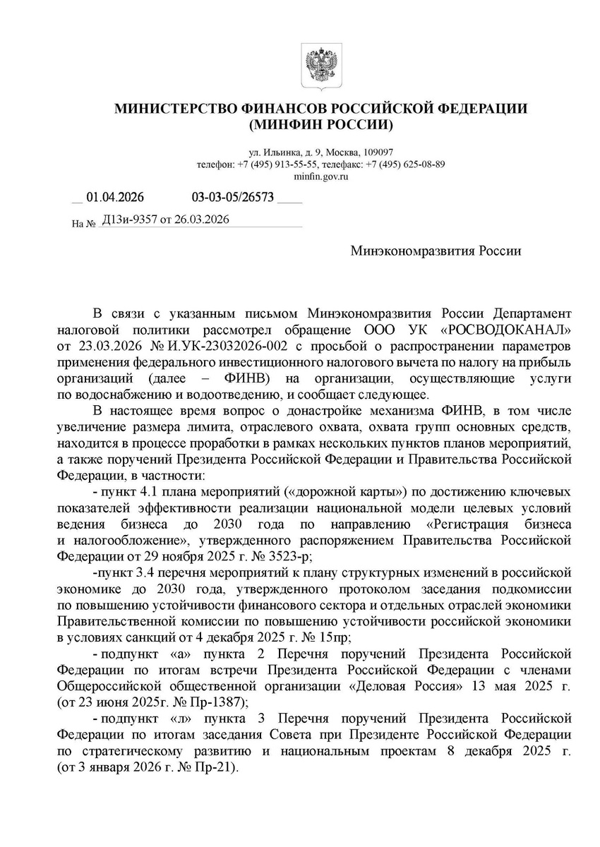 ✏️ Водоснабжение и канализация: 👆 Минфин и Минэкономразвития России считают, что водоканалам нет необходимости предоставлять возможность применения федерального инвестиционного налогового вычета (ФИНВ), так как у них есть другой способ снижения своей налоговой нагрузки в рамках действующего законодательства 📄 Такую позицию оба министерства направили в ответ на коллективный запрос РАВВ вместе с частными операторами водоснабжения и водоотведения о предоставлении ФИНВ водоканалам по аналогии с другими отраслями, где такой вычет уже применятся. ❗️По данным ведомства, водоканалы, согласно положениям статьи 286.1 главы 25 Налогового кодекса Российской Федерации, могут, вместо федерального инвестиционного вычета, применять региональный. Для этого необходимо наличие соответствующего решения субъекта РФ, которое позволит уменьшить исчисленную сумму налога на прибыль организаций (авансовых платежей), в частности, на сумму расходов, связанных с приобретением (созданием) или модернизацией (ре