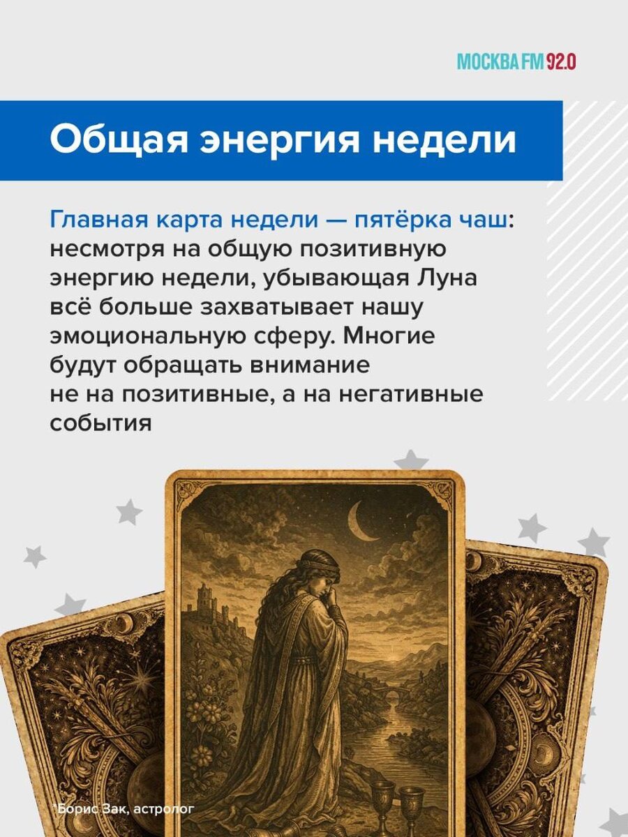 Девиз на ближайшие дни сформулировал в эфире «Москва FM» астролог и таролог Борис Зак: Мы сможем многого добиться, если будем мыслить позитивно. Ну а что нам пообещали карты в каждый из грядущих дней недели — смотрите в материале выше! 📌 Подписаться на Москва FM / Наш чат-бот / Мы в MAX