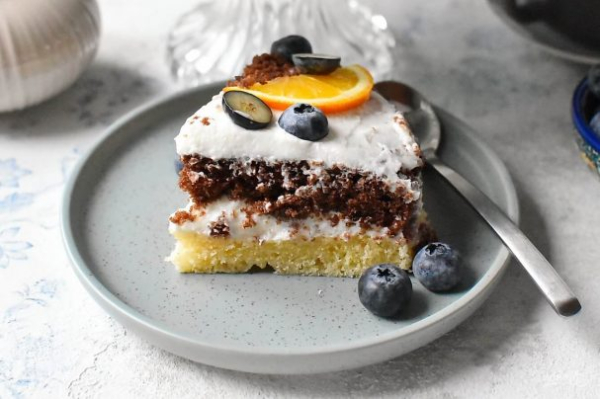 Уложите сверху темный корж и смажьте остатками сметанного крема.