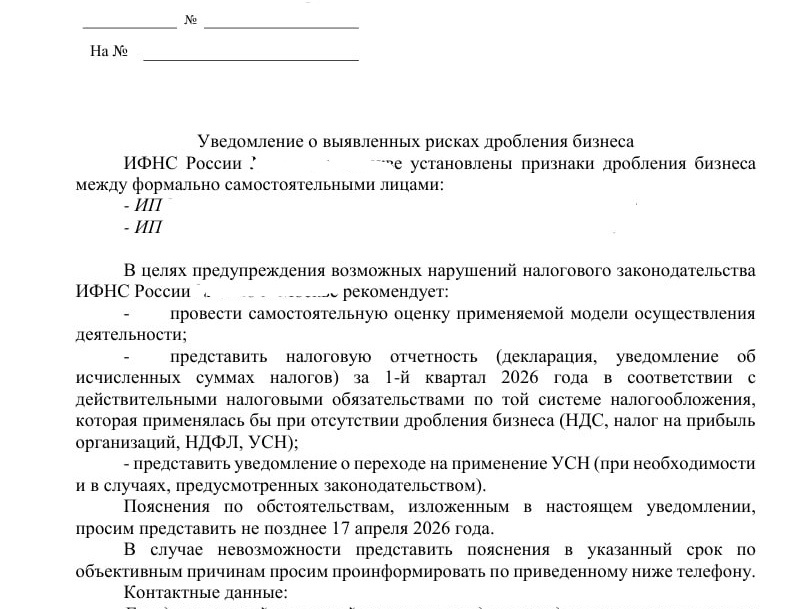 Например, по представленному на фото уведомлению по теме дробления бизнеса мы попросим клиента ответить на следующие вопросы: