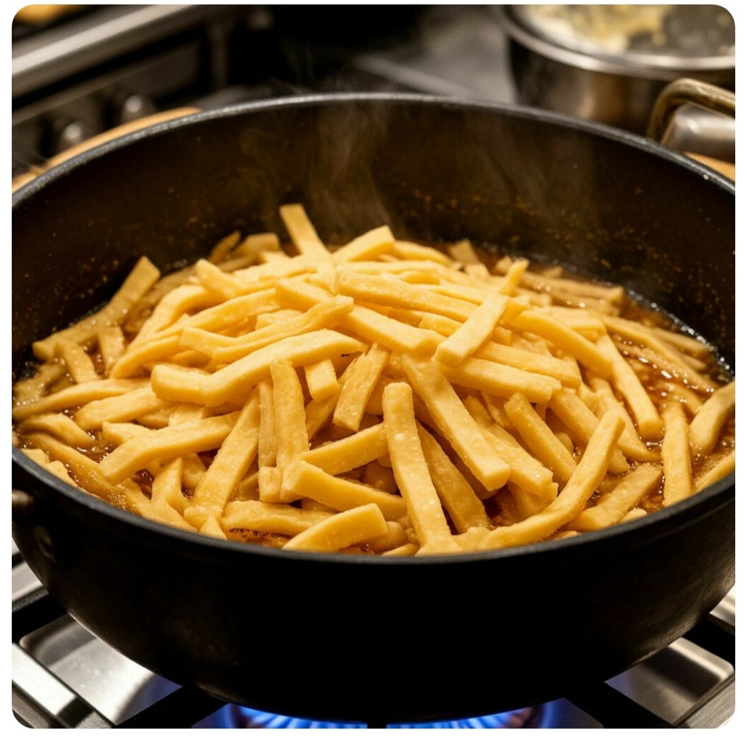 .Второе — масло «не добирает» жара или температура всё время скачет: шипение вялое, жарка тянется, а поверхность выходит жирной. Такая соломка не подсушивается, а пропитывается, и в сиропе тут же тяжелеет и слипается.