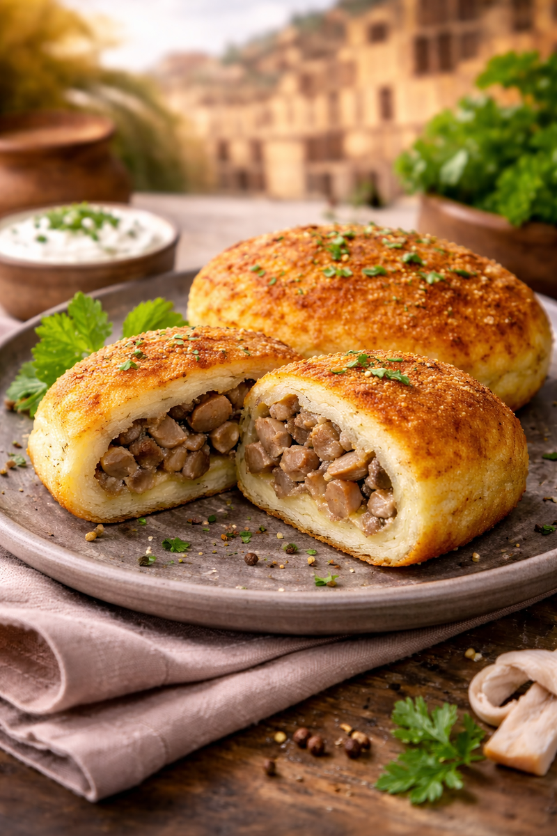 (Кулинарная сказка, от которой потеплеет на душе и в животе) В некотором царстве, в Кухонном государстве, жил-был Король Картофель. Был он статен, могуч и весом ровно 500 граммов. Но однажды злая ведьма Кастрюля бросила его в кипящую воду. Король думал, что пришёл его конец, но нет! Он вышел из испытания преображённым — нежным, податливым и готовым к великим свершениям. Ведьма лишь добавила ему щепотку Соли, чтобы характер не был пресным, и растолкла его в пюре — основу для будущего героя. А в дремучем лесу Шкафчика жили скромные отшельники — Шампиньоны (200 г) и мудрый старец Лук (1 шт.). Позвал их Король Картофель на великое дело. Нарезали их кубиками и бросили на раскалённую сковороду-меч. Обжарили до золотистого вида, добавили немного живой воды и потушили 5 минут, чтобы они стали мудрее и ароматнее. Так родилась Грибная Начинка — сердце будущего воина. И решил Король Картофель создать защитника границ своих, чтобы не скучно было ему одному в тарелке. Стал он лепить из себя лепёшки