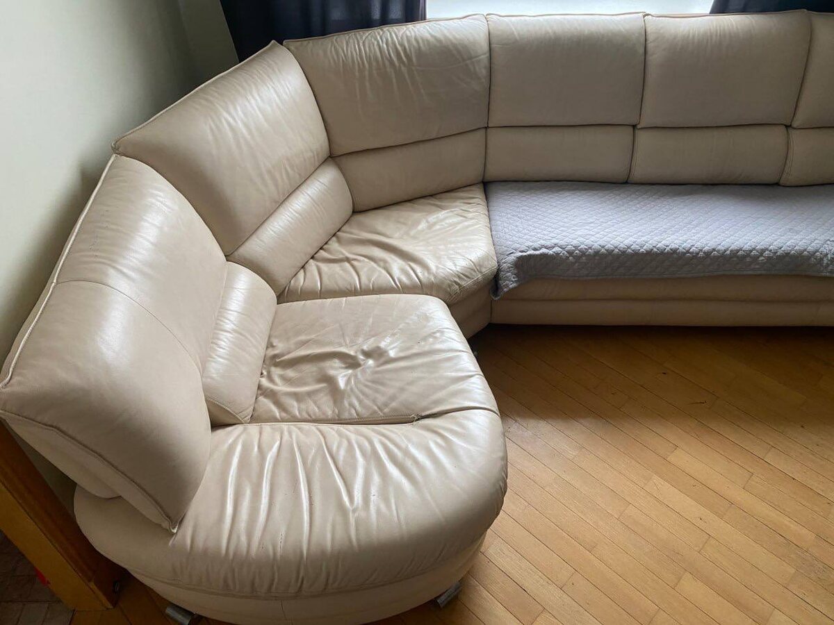 Отдам даром Итальянский кожаный диван угловой. Не раскладывается. На сиденье есть порванные участки.