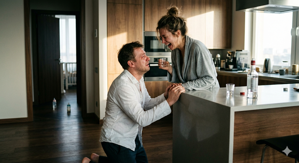 Валерия смотрела на стоящего на коленях мужа, и в ее голове лопнула какая-то струна. Шок сменился диким, абсурдным облегчением. Она на ватных ногах подошла к столешнице, взяла бутылку и отпила прямо из горла. Жгучая жидкость обожгла горло, возвращая в реальность.