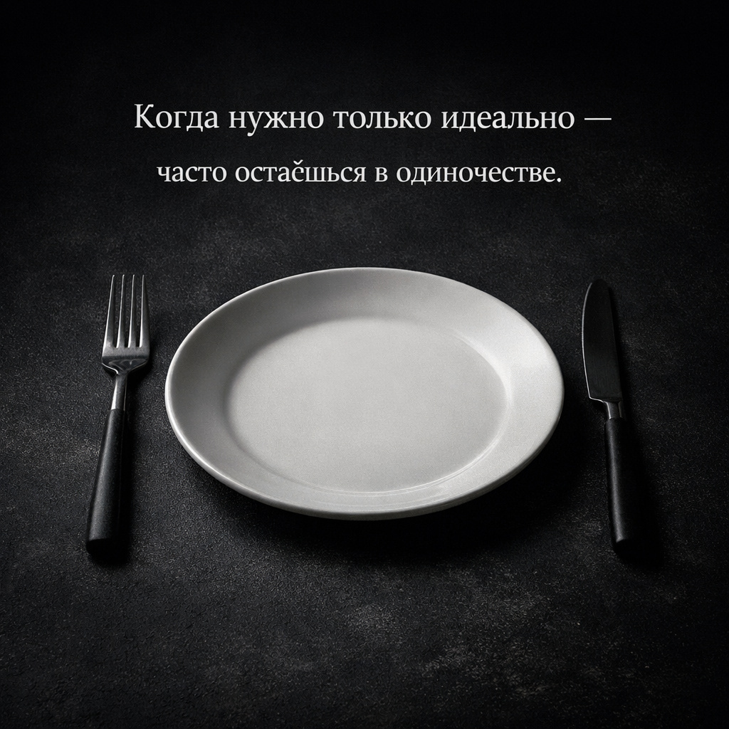 - Нет. Я буду есть только в ресторане. С красивой подачей. С идеальным вкусом. Чтобы всё было как в кино. И… остаётесь голодной. Не потому что еды нет. А потому что она не та. Примерно так живут люди с установкой “все или ничего”. На первый взгляд это может выглядеть как каприз. Но если посмотреть глубже, там много внутренней жесткости, где есть только два варианта: либо идеально, либо не имеет смысла! И звучит это вроде бы красиво. Как сила. Как уважение к себе. Правильно. Без компромиссов. Но проблема не в том, что вы хотите лучшего, а в том что все остальное, не идеальное - обнуляется. В отношениях это звучит так: И это логично. Правда? Потому что за этими убеждениями часто стоит усталость, страх