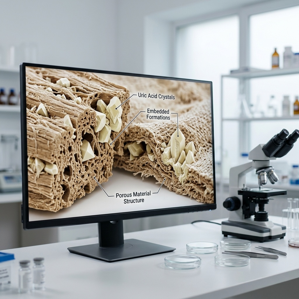 - Кристаллы мочевой кислоты сохраняются в порах материала