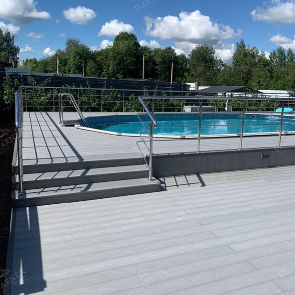 У бассейна обычные материалы быстро сдают позиции. Дерево темнеет, плитка становится скользкой, а дешёвые покрытия не выдерживают постоянной влаги и солнца. Поэтому всё чаще для таких зон выбирают террасную доску из ДПК. Главный плюс ДПК — он хорошо работает именно там, где много воды. Материал не гниёт, не разбухает и не требует постоянной покраски. А если выбрать доску с антискользящей поверхностью, терраса становится ещё и безопасной — даже после купания. Но есть ещё один важный момент: под террасой должна быть вентиляция. Если влага будет застаиваться под настилом, это быстро скажется на основании и сроке службы всей конструкции. Поэтому правильный монтаж здесь не менее важен, чем сама доска. Для зоны у бассейна лучше выбирать: Именно такое решение даёт то, что нужно у бассейна: безопасность, аккуратный вид и нормальную долговечность.