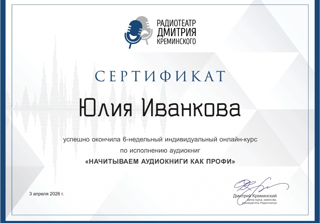 Спешу поделиться радостью, я закончила курсы исполнительского мастерства от радиотеатра Дмитрия Креминского 🥳