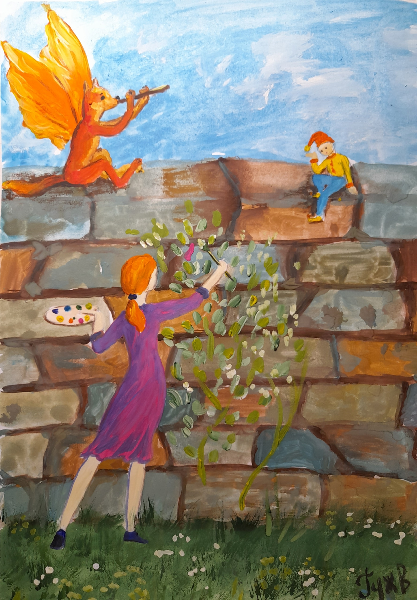 А потом и с наружной стороны стены нарисовала лианы – ипомею, кампсис, виноград девичий, вьющуюся фасоль. Рядом же нарисовала барбарис, гортензию, спирею, каркаде, и сирень. Чтобы ароматом своим цветущие кустарники радовали всех прохожих.