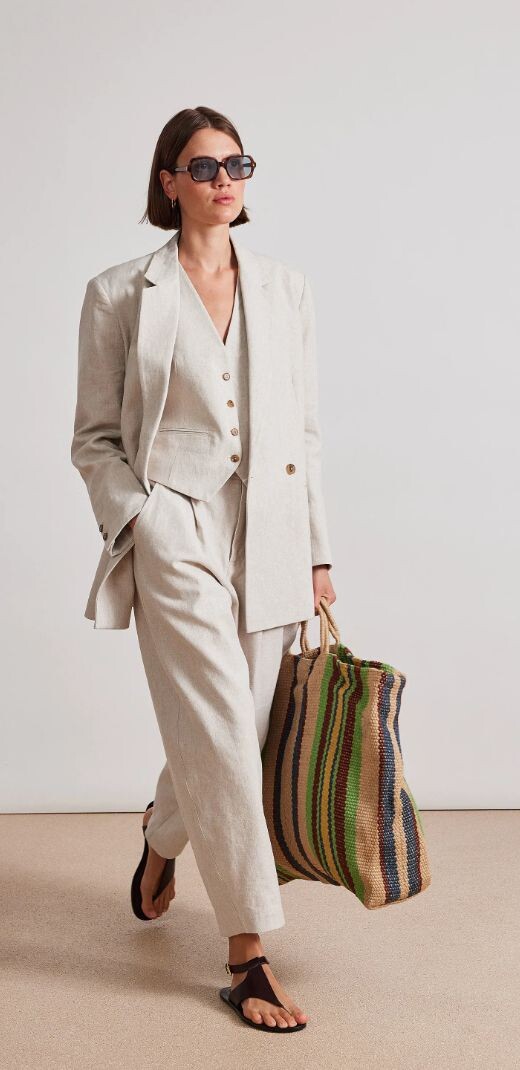 Третье: ткань. Я думала, что костюмная ткань - это обязательно плотная синтетика, в которой потеешь. Но летние костюмы шьют из льна, хлопка, вискозы, шелка. Они дышат. Они легкие. Они не мнутся так страшно, как чистый лен (производители добавляют эластан или вискозу, чтобы сохранить форму).