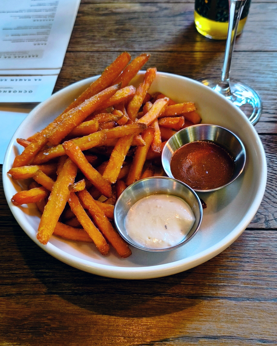 Ох, как я жалею, что мы сюда пришли сытыми. Очень соблазнительное меню! Мне не удалось попробовать, например, сезонную окрошку с копченой форелью или дачный оливье с ней же. Или тартар из говядины или из форели. Или что-то из овощей на гриле. Мне продолжать? Не омрачило, но стало штрихом к портрету, что от персонала веяло прохладой. Нет, к нам были внимательны, но, знаете, я всё же погружена в тему изнутри и снаружи, плюс доминирующая пиар специфика моей деятельности помогает распознавать тон коммуникации... По ощущениям было, что нам, нищебродам, тут не рады. Вообще мы могли бы и на напитках остановиться, ибо закончили обедать буквально за 15 минут как пришли сюда полюбопытствовать на будущее. Потому заказали всего две закуски, которые нам обоим весьма понравились: