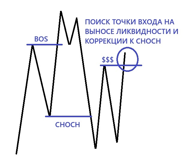 Для более детального понимания всего о чем я буду писать лучше всего ознакомиться с понятием структуры и ликвидности на графике. Торговый контекст практически всех моих сделок выглядел так: Теперь давайте разбираться по пунктам, что же должно произойти, чтобы мы могли найти место откуда цена с большей долей вероятности пройдет большое количество пунктов и даст нам хорошее соотношение риск прибыли: 1. CHOCH - смена настроения рынка. Важно, чтобы вы правильно определяли ее. У меня своя методика определения сильного Choch на графике. 2. Коррекция после CHOCH и формирование локального экстремума на графике (на схеме обозначен $$$). 3. Обязательный ложный пробой локального экстремума и поиск точки входа на данном выносе ликвидности. P.S. Ложный пробой и вынос ликвидности - это одно и тоже. Рекомендация по данной сделке была в моем телеграм канале: Это получилась самая ложная сделка из всех по причине одного перезахода и двух снятий ликвидности с двух экстремумов. Вся схема действий на дан