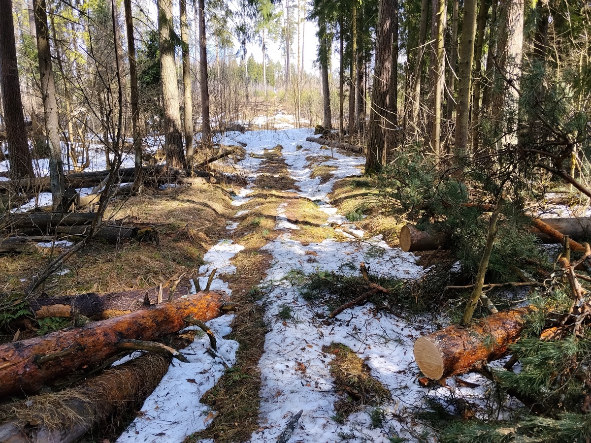 На борщесубботник 5 апреля никто не заявился. Я решил, что выйду копать когда мне будет удобно. Удобно оказалось не в 11 утра, как я изначально планировал, а к 16 вечера. А днём я взял свою электропилу и побежал наводить порядок на тропинках. Всю мелочь, что я распилил, я снимать не стал. Покажу самое интересное. Вот один из самых толстых стволов за этот день. Фактически, я сделал только полтора распила, один полный и один частичный на месте естественного излома ствола, дабы добить этот излом. А дальше пути нет, поскольку дальше - дно оврага, где разлилось болото. Через пару недель проход вновь будет возможен, половодье уйдёт. А это дерево просто зимой нагнулось от снега и загородило проход. Когда можно не пилить живое завалившееся дерево - я стараюсь не пилить. Нашёл неподалёку упавшую не очень толстую мёртвую ель, распилил её на 2 подпорки и просто приподнял этот ствол, восстановив проход. А вот ещё один елепад, 2 ели разом за зиму. Оттаяли - распилил. А вообще, лес у нас очень кра